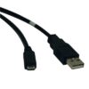 Los micro USB son la siguiente generación de conectores USB que se encontrarán en teléfonos celulares, PDA, dispositivos USB en movimiento (OTG), cámaras digitales y más. Más pequeños y duraderos (10.000 ciclos de inserción) que los conectores mini B existentes, los micro USB también manejarán transferencia de energía y de datos. El USB Implementers Forum ( USB-IF ) ha diseñado el micro USB para eliminar muchos de los mini conectores de propiedad exclusiva que se encuentran en los dispositivos digitales de distintos fabricantes y será la conexión USB estándar en los teléfonos de la mayoría de los fabricantes de telefonía celular. El cable clasificado como USB 2.0 maneja velocidades de transferencia de datos de 480Mbps. Garantía de por vida de Tripp Lite.