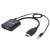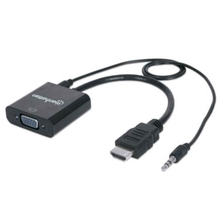 Conecta fácilmente una fuente HDMI a una pantalla VGAEl Convertidor HDMI a VGA de Manhattan ayuda a estabilizar una conexión rápida, sencilla y funcional entre modelos recientes de computadoras y fuentes de medios equipados con HDMI con monitores, proyectores y otras pantallas con entrada VGA. El Convertidor HDMI a VGA de Manhattan se instala fácil y rápidamente y no requiere complicadas configuraciones para extender el tiempo de vida y aprovechar la inversión realizada en pantallas VGA, proyectores y otros equipos. Esta solución de bajo consumo de energía, rentable y confiable permite a los usuarios transmitir el ancho de banda de HDMI, su resolución, sus colores y más, sin la necesidad de gastar en actualizar a nuevos y costosos monitores y proyectores. Su diseño «todo en uno» ayuda a tener una solución compacta e integrada que elimina cables innecesarios, enredos y desorden para mantener las instalaciones y los espacios de trabajo ordenados. Su puerto estéreo de 3.5 mm permite al co