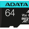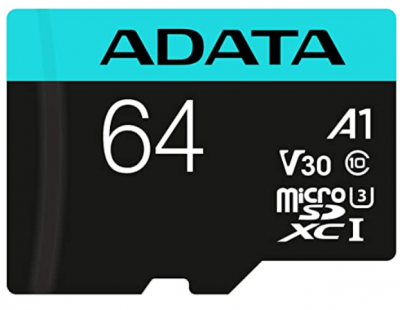 Micro Secure Digital ADATA Premier A2 UHS-I 64GB Class 10 (V30), Velocidad de lec/esc 100/80 (MB/s). N.P. AUSDX64GUI3V30SA2-RA1
