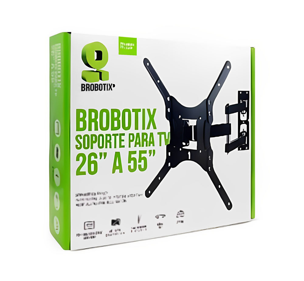 SOPORTE DE PARED PARA PANTALLA DE 26” A 55”, ARTICULADO, CON INCLINACIÓN (651589), Brobotix El Nuevo Soporte de Pared para Pantallas de 26″ a 55″ Articulado BRobotix es la solución perfecta por contar con Inclinación de 15º, lo cual te permite instalar sin problema cables a tu pantalla además de brindar mayor comodidad y evitar reflejos. Adicional, tiene Giro horizontal que te permitirá ajustar tu pantalla para verla desde cualquier ángulo. ¡Muévela horizontalmente gracias a los 180º de giro en el brazo del soporte! Soporte para pantallas/monitores de 26” a 55” Articulado. Giro horizontal de 180º. Resistencia sólida gracias a su construcción en acero. Base desmontable que facilita la instalación. Incluye tornillería. Color negro. Especificaciones: Capacidad de Carga: 35 kg. Grado de inclinación: 10º hacia arriba, 15º hacia abajo. VESA 75/100/100×200/200/400. Soporta hasta 35 Kg, e incluye tornillería para su instalación. Color: Negro